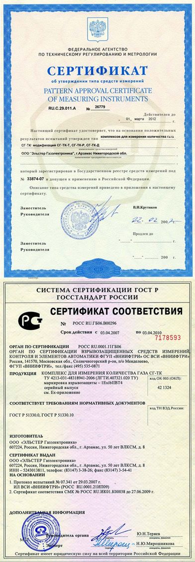 Принцип действия комплекса СГ-ТК основан на одновременном измерении объема газа (при рабочих условиях), прошедшего через счетчик и температуры газа с последующим вычислением, обработкой и архивированием приведенного к стандартным условиям объема газа с учетом условно-постоянных (подстановочных) значений давления и коэффициента сжимаемости газа спомощью корректора объема газа ТС210.