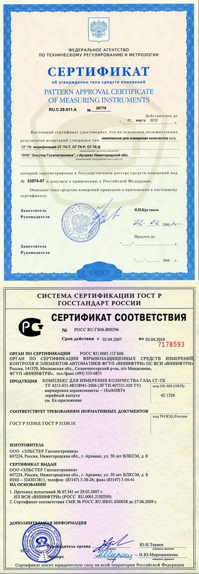 Принцип действия комплекса СГ-ТК основан на одновременном измерении объема газа (при рабочих условиях), прошедшего через счетчик и температуры газа с последующим вычислением, обработкой и архивированием приведенного к стандартным условиям объема газа с учетом условно-постоянных (подстановочных) значений давления и коэффициента сжимаемости газа спомощью корректора объема газа ТС215.