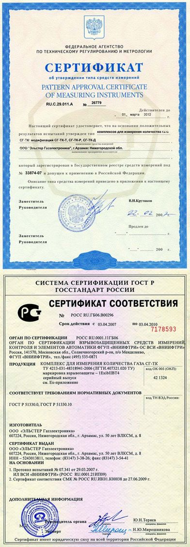 Комплекс СГ-ТК состоит из корректора объема газа и счетчика газа. В зависимости от типа применяемого корректора объема газа комплекс СГ-ТК имеет следующие исполнения: