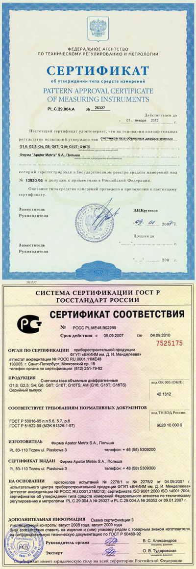 Счетчик газа объемный диафрагменный изготовлен согласно технической документации, соответствующей директивам ЕЭС о счетчиках газа, российским и международным метрологическим требованиям для измерительных приборов и методов метрологического контроля. Счетчик предназначен для учета потребляемого углеводородного газообразного топлива.
